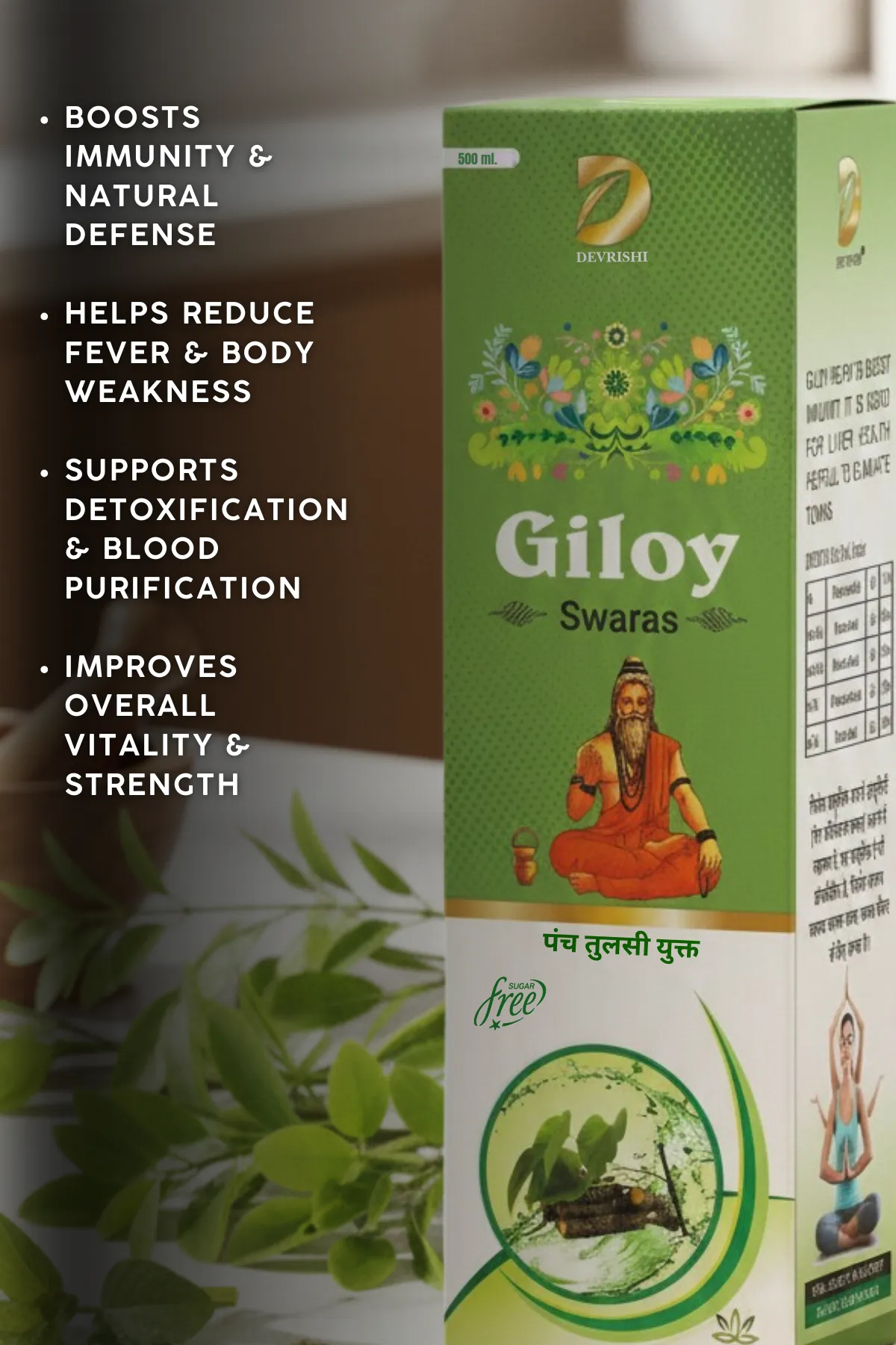 Devrishi Giloy Swaras (500 ml) is a traditional Ayurvedic formulation made from Giloy (Tinospora cordifolia), widely valued for its immunity-enhancing and rejuvenating properties.