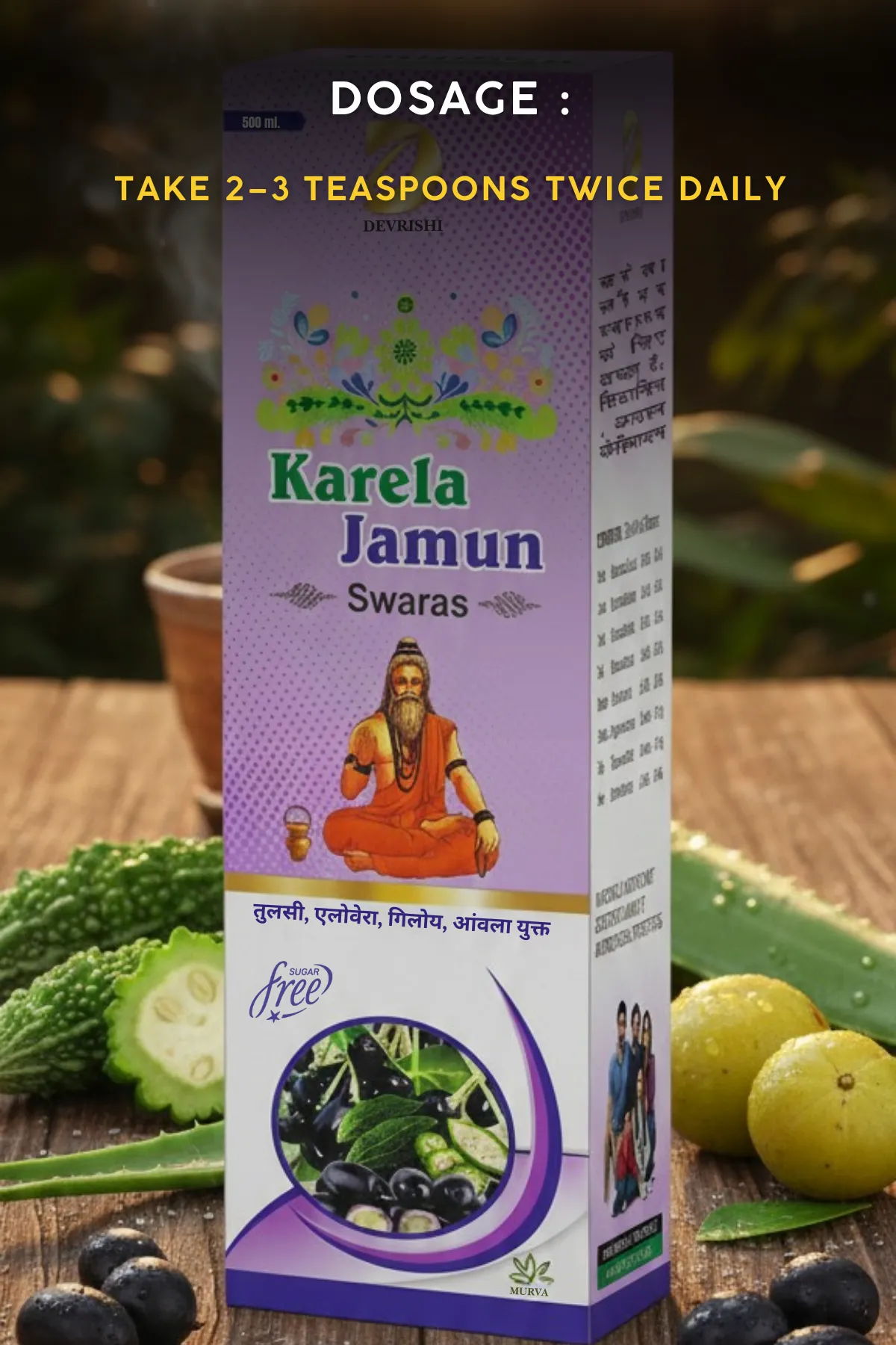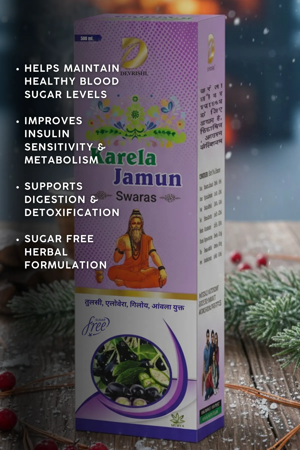 Devrishi Karela Jamun Swaras (500 ml) is a traditional Ayurvedic formulation made using Karela (Bitter Gourd) and Jamun (Indian Blackberry), both widely used in Ayurveda to support blood sugar balance and metabolic health.