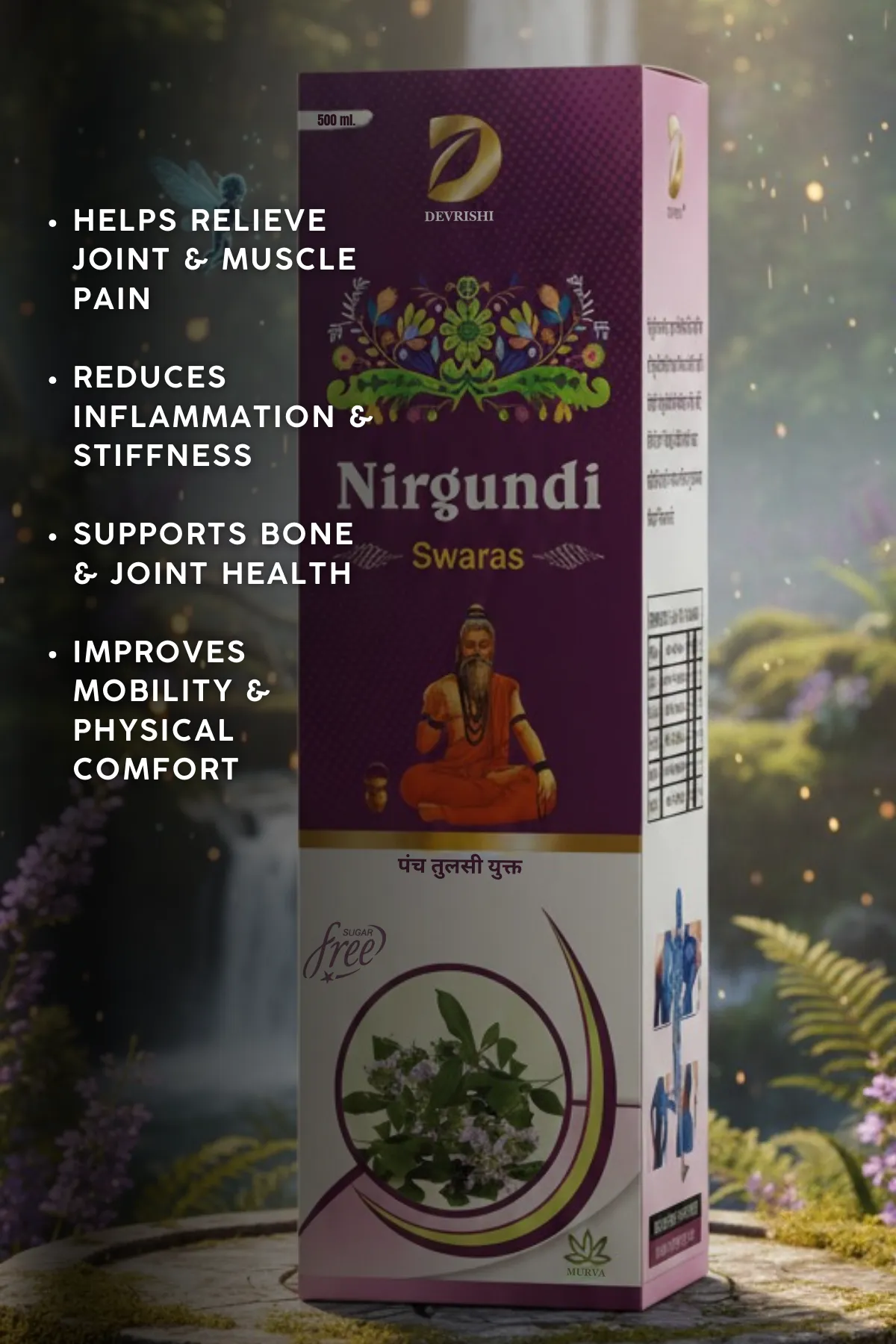 Devrishi Nirgundi Swaras is a sugar-free Ayurvedic herbal juice that helps relieve joint and muscle pain, reduces inflammation and stiffness, supports bone and joint health, and improves mobility and physical comfort.