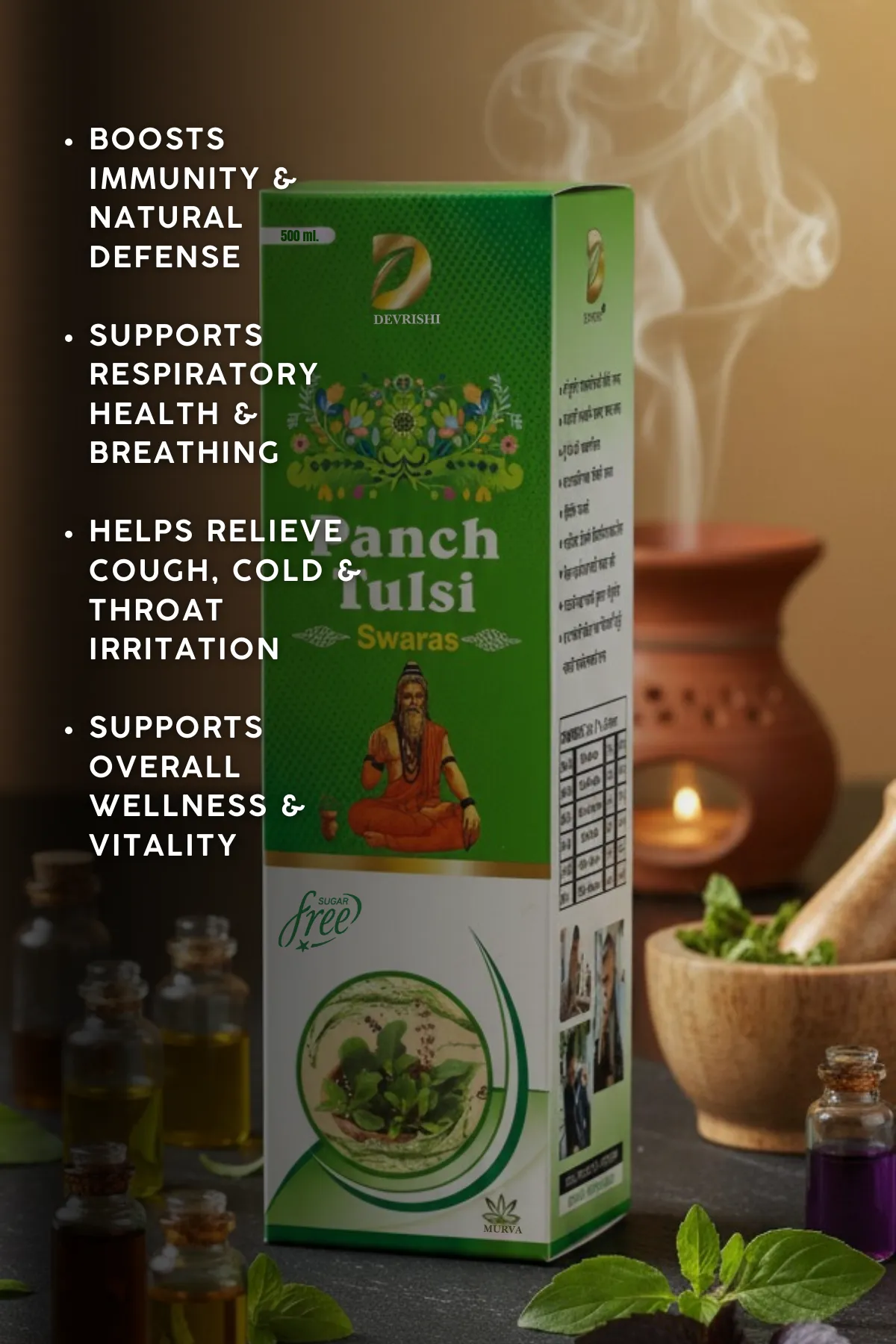 Devrishi Panch Tulsi Swaras (500 ml) is a powerful Ayurvedic formulation prepared from five varieties of Tulsi, traditionally revered for their immunity-enhancing and respiratory-supporting properties.