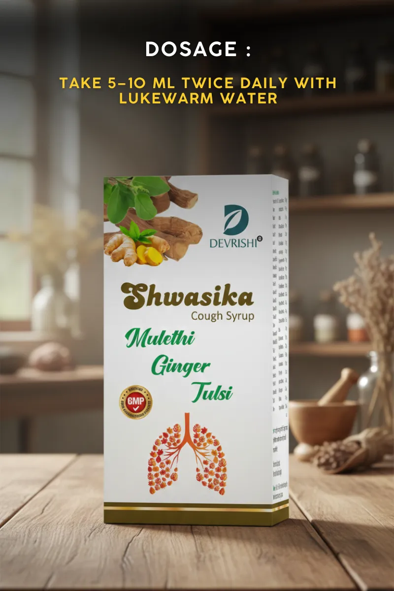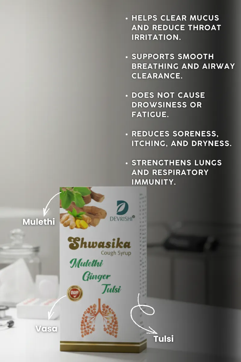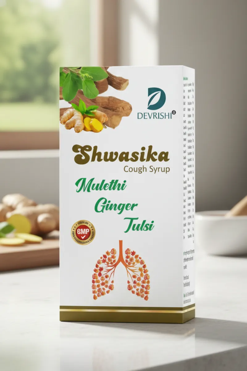 Devrishi Swasika Cough Syrup is a time-tested herbal formulation designed to relieve cough, chest congestion, throat irritation, and respiratory discomfort. It works by loosening phlegm, clearing airways, and soothing inflamed respiratory passages.
