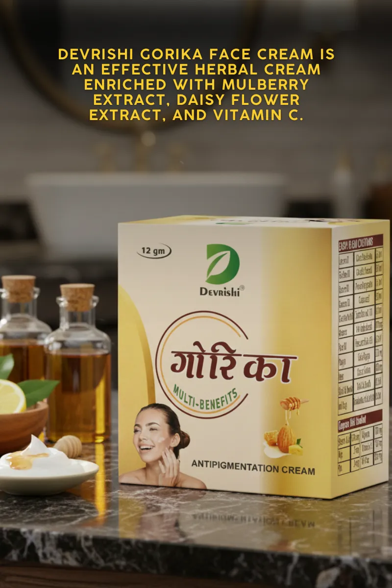 Devrishi Gorika Face Cream is an effective herbal cream enriched with Mulberry Extract, Daisy Flower Extract, and Vitamin C. Its unique and natural formulation prevents melanin synthesis and gives you soft and glowing skin. It reduces pigmentation and blemishes by restricting melanin deposits that appear as dark spots, patches, and hyper-pigmentation, thereby offering an even skin tone.