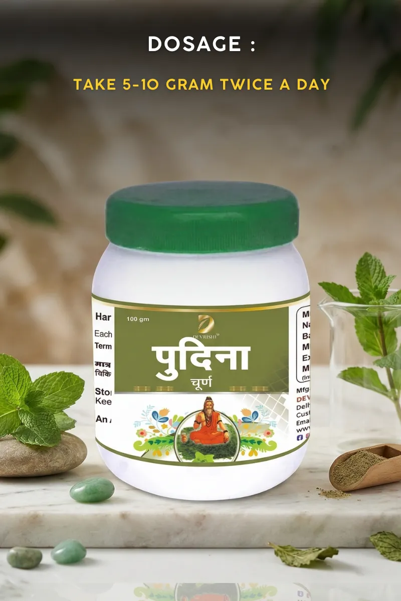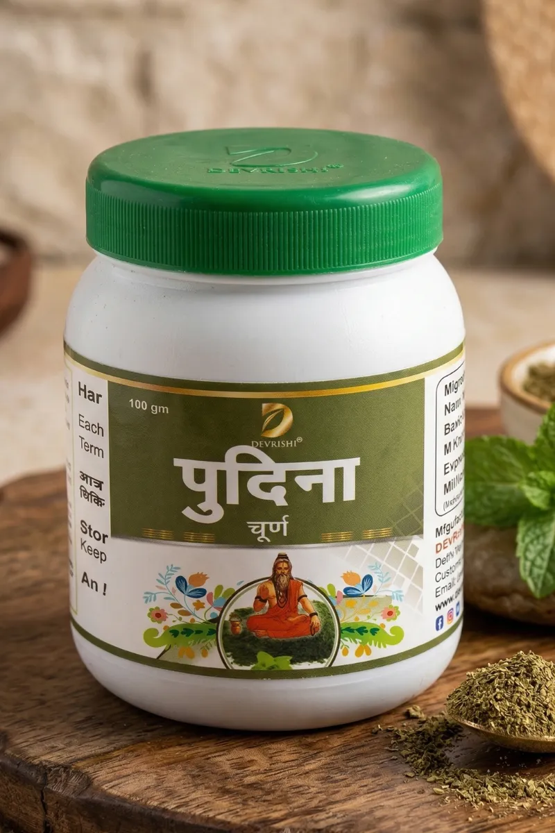 Pudina Churna (Mint Powder) is a traditional Ayurvedic herbal powder made from dried mint leaves (Mentha). It is widely used for its digestive, cooling, and soothing properties.