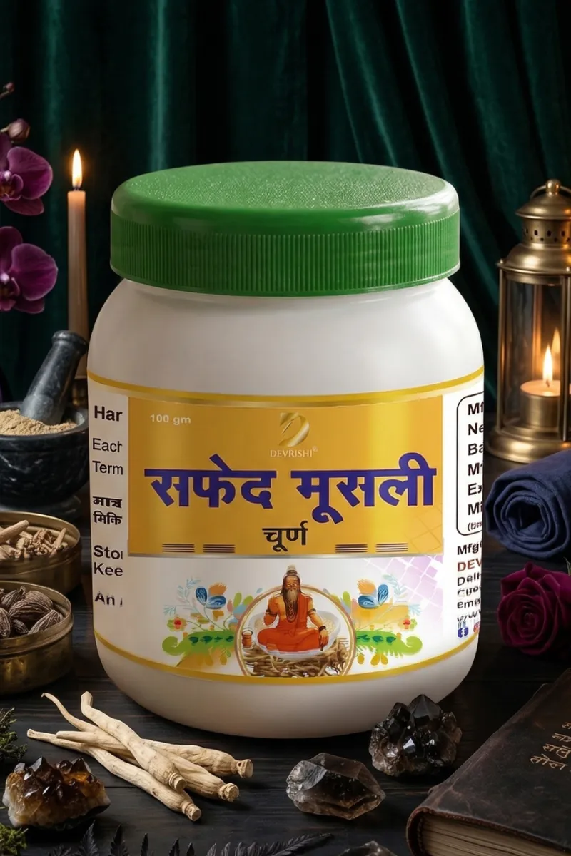 Safed Musli Churna is a powerful Ayurvedic herbal supplement made from Safed Musli (Chlorophytum borivilianum), widely known for its rejuvenating and energy-boosting properties.